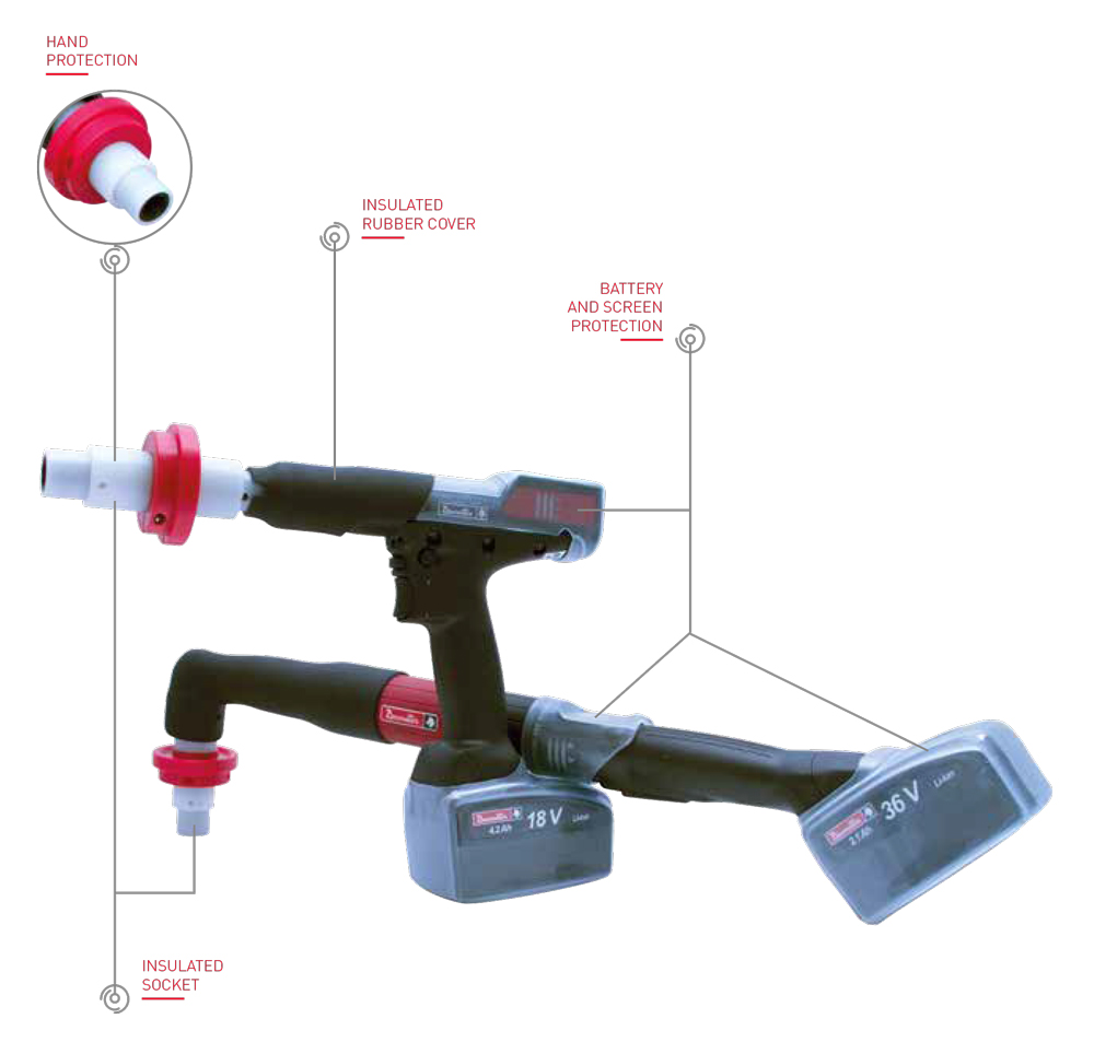 - เครื่องมือ Electric Nutrunner ที่หุ้มฉนวนและแยกออกจากกันซ็อกเก็ต Socket ได้รับการออกแบบมาเพื่อป้องกันผู้ใช้งานกับงานประกอบอุปกรณ์ไฟฟ้าแรงดันสูง เช่น แบตเตอรี่โมดูล และสายเคเบิลของรถยนต์ไฟฟ้า