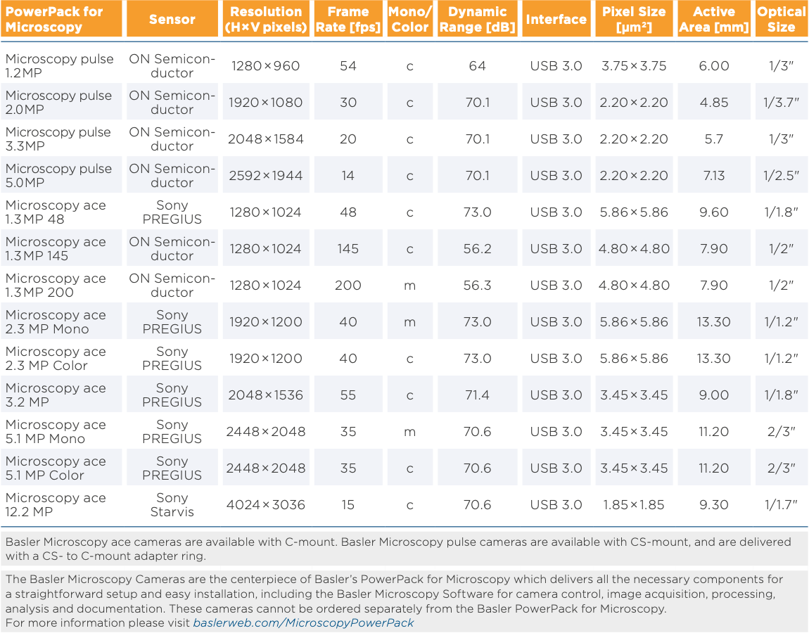The Basler Microscopy pulse cameras with resolutions between 1.2 MP and 5 MP come with USB 3.0 as standard interface. The established ON Semiconductor CMOS sensor technology offers accurate and reproducible results for a broad range of standard light microscopy applications. Your benefits include :
